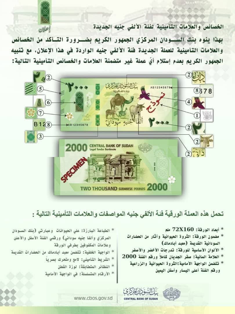According to information obtained by Sudanese Opinion, the Central Bank of Sudan has officially introduced the new 2000-Sudanese pound banknote, equipped with a comprehensive set of advanced security features designed to prevent counterfeiting and strengthen confidence in the national currency.